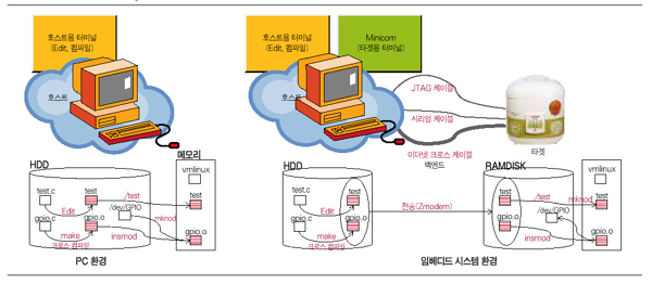 하지만 임베디드 시스템 소프트웨어 개발 과정은 소스 코딩을 하고 컴파일을 수행한 후 이를 타겟 시스템으로 전송한다. 그리고 전송된 실행 코드를 타겟에서 실행한다.