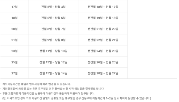 카드 혜택을 받기 위해 전월실적을 채우려면 전월1일부터 전월말일까지 금액을 집계해서 사용하기에 결제일을 잘 선택하여야 실적을 채울수 있죠