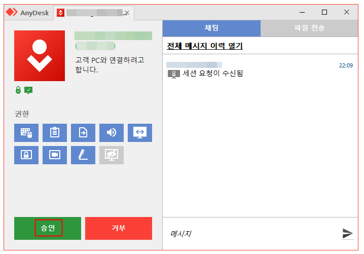 원격제어를 받을 컴퓨터에 아래와 같이 접속 요청창이 뜹니다.