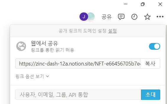 노션으로 만든 페이지는 공유 버튼을 눌러 웹에서 공유를 활성화 시킬 수 있습니다.