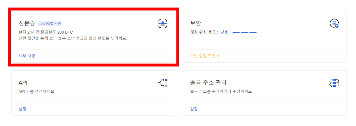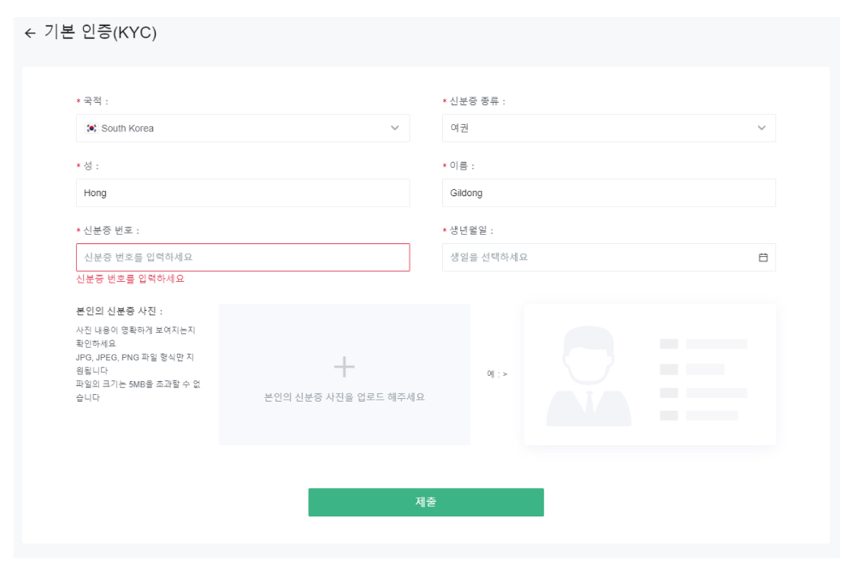 메뉴에서 신분증 - 기본 인증(KYC) 메뉴를 눌러주시면 됩니다.