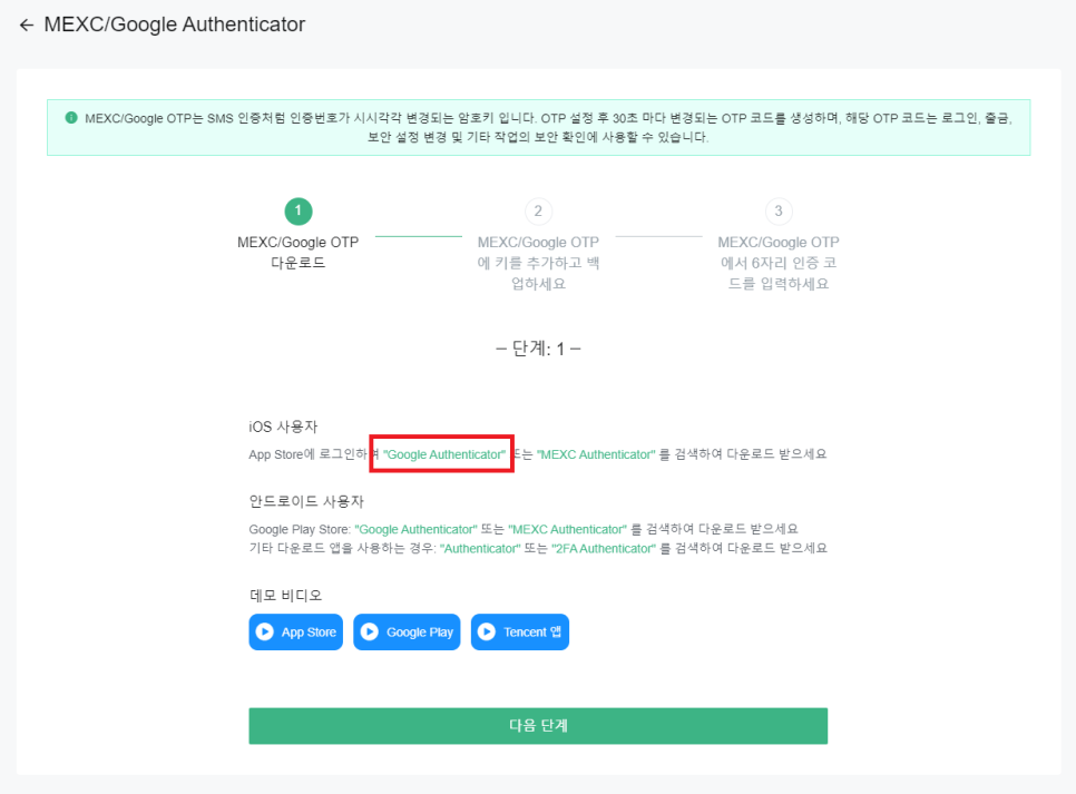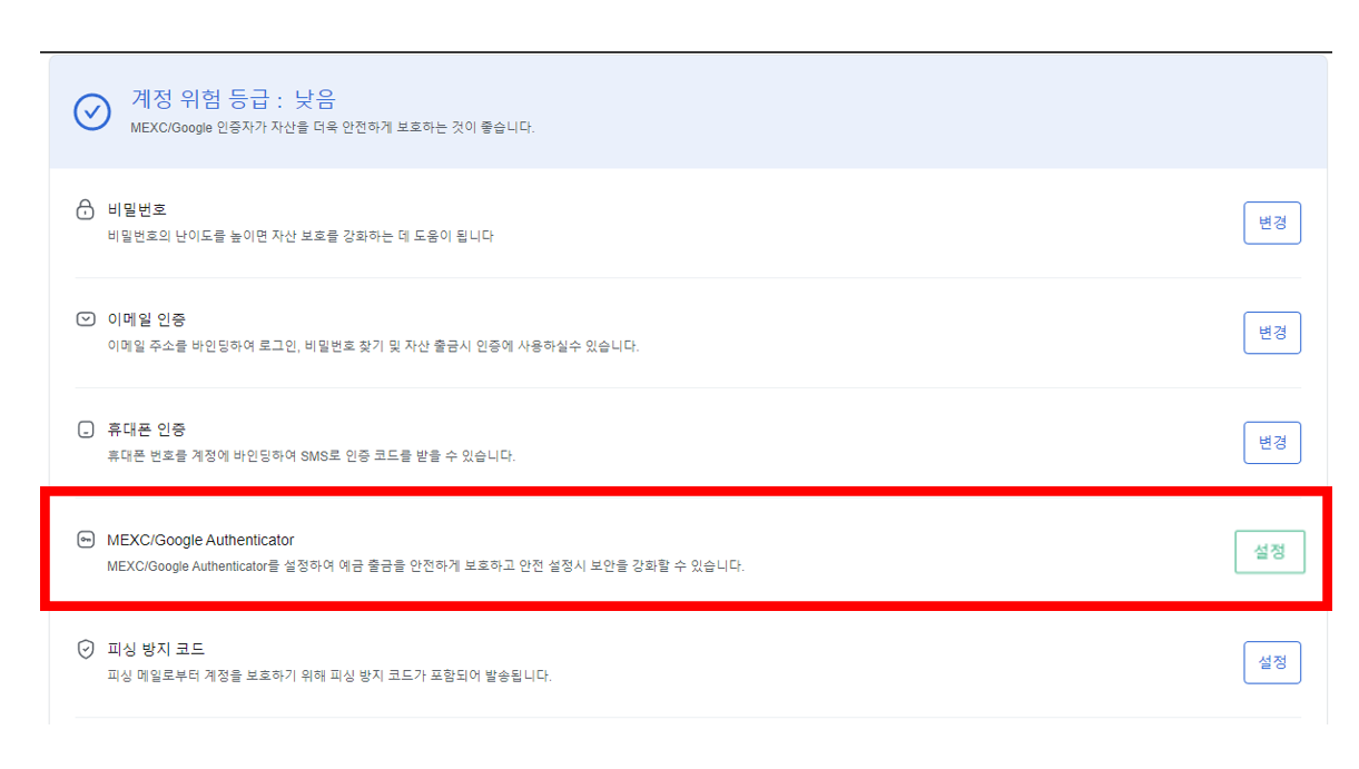 구글 OTP 부분을 해주세요. 휴대폰 인증도 하셔도 좋습니다.