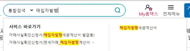 국세청 홈택스 상단 검색창에서 [매입자발행세금계산서]를 검색하여 클릭합니다.